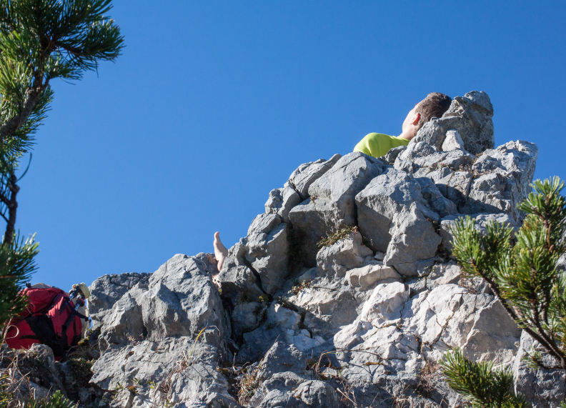 Die Beeren sind Augenschmaus und Gaumenfreude zugleich: Unsere Zungen sind schon ganz blau von den vielen verspeisten Beeren. Sich damit satt zu essen, ist dennoch schwer: Es wird Zeit für eine kleine Brotzeit. Dafür suchen wir uns ein schönes Fleckerl am sonnigen Gipfel, den wir kurze Zeit später erreichen. Jemand hat aus einem Holzbrett eine provisorische Bank gebastelt. Wir nehmen Patz, beißen herzhaft in unsere Brote und lassen dabei einige Zeit Beine und Seele baumeln und den Blick über die Berggipfel am Horizont schweifen. Aber nicht zu viel essen: Auf unserer Genusstour darf eine Einkehr auf einer Berghütte nämlich nicht fehlen!
