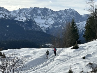 Leichte Winter-Bergwanderung auf den Hoher Kranzberg 1391 m. Die Tour startet am Bahnhof Mittenwald und führt zuerst vorbei an Lautersee und Ferchensee bergauf. Durch Wald und offene Hänge steigen wir weiter Richtung Kranzberg. Am Ende kehren wir im gemütlichen Berggasthof Kärntner Alm — dieser hat am 30. November seinen letzten Öffnungstag der Saison. Danach geht es zurück zum Bahnhof Mittenwald.