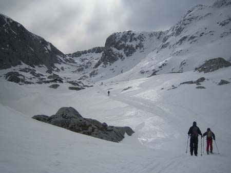 Lange Querung durch Karstgelände. Noch glaubt jeder an eine unangenehm eisige Abfahrt….