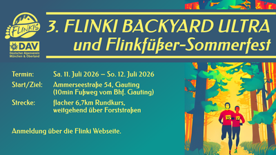 Wir veranstalten den ***3. Flinki Backyard Ultra in Gauting*** - yeah! :-) Zu schlagen sind sowieso erst einmal alle anderen Läuferinnen und Läufer, aber auch die 15 Runden von Patrick aus der zweiten Edition in 2025. Start- und Zielbereich ist in ca. 10 Gehminuten vom S-Bahnhof Gauting zu erreichen - somit ist eine An- und Abreise mit Öffis möglich und empfohlen. Im Garten von Gerhard & Cordi dürfen wir den Start- und Zielbereich einrichten - und es ist ausreichend Platz für eure Ausrüstung, Verpflegung, eventuelle Sitz- / Schlaf-Setups sowie eure Support Crew. Eine Mail mit allen Details geht im Vorfeld der Veranstaltung an alle Teilnehmer*innen raus.