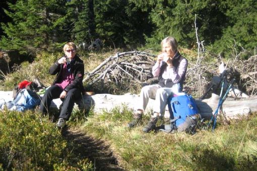 Am Gipfel des Stolzenberges rasten wir im Sonnenschein mit herrlichen Ausblicken ins Gebirge und zum Spitzingsee.