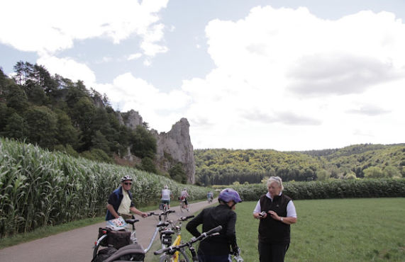 Die Radlstrecke ist gut ausgeschildert, und wir freuen uns an den weißen Kalkfelsformationen – z. B. den 12 Aposteln, die immer wieder aus dem Wald herausblitzen und unsere Fotografen anhalten lassen. Wassersportler jeden Alters begleiten unsere Wegstrecke auf der Altmühl.