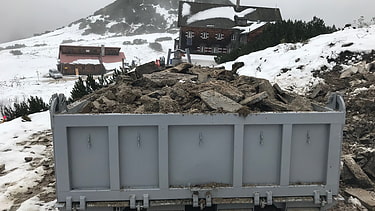 Der Anbau aus den 60er-Jahren wird abgerissen. Um die Statik der Hütte nicht zu gefährden, wird Schicht für Schicht abgetragen. Der Anbau wird später durch einen neuen, größeren ersetzt.