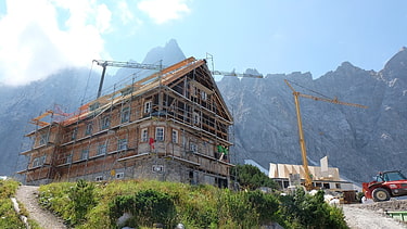 Die Grundsanierung der Falkenhütte war mit Gesamtkosten von 6,4 Millionen Euro das bisher größte Hüttenprojekt, das die Sektion Oberland jemals in Angriff genommen hat. Unser Ziel war es, die denkmalgeschützte Hütte zu erhalten und für die nächsten Jahrzehnte zu wappnen. Das Juwel im Karwendel wurde sanft, aber dennoch vollständig generalsaniert, ohne den legendären Charakter der Hütte zu verändern. Auch wurde das bisherige Schlafgebäude abgerissen, neu erbaut und die Technik auf den aktuellen Stand gebracht. Dabei stand für uns besonders der Umwelt- und Klimaschutz im Vordergrund: Statt mit Dieselaggregaten wird die Falkenhütte nun mit grüner Energie versorgt, es wird mit Bioflüssiggas gearbeitet, und Textilien wie Matratzen, Bettwäsche oder Vorhänge wurden nach Ökostandards gewählt – um nur ein paar Punkte zu nennen. Die detaillierten Maßnahmen können im Bautagebuch auf dieser Seite über die komplette Zeit der Sanierung zurückverfolgt werden.