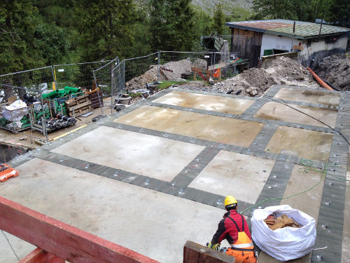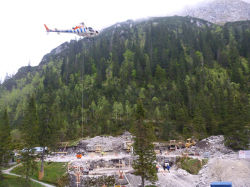 Dazu mussten 54 qm Beton mit dem Hubschrauber angeliefert werden. Damit das auch zügig geht, waren hier zwei Hubschrauber gleichzeitig im Einsatz.