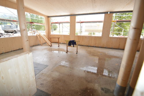Das Baufeld vor der Hütte ist bereits weitgehend geräumt, sodass sich die Arbeiter vor Ort in den verbleibenden zwei Wochen ganz der Fertigstellung der Gebäudehülle widmen können.
