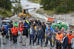 Trotz der widrigen Verhältnisse ist es in einer kurzes Phase der Wetterbesseung gelungen, den Kran auf die Baustelle zu fliegen und vor Ort zu montieren. Daneben wurden gleich wieder große Mengen an Baumaterial (insbesondere Stahl für die Armierungen und Schalungsteile) raufgeflogen, damit die Arbeiten nicht durch fehlendes Material aufgehalten werden.