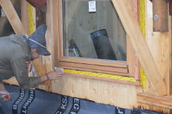 Und hier läuft die Arbeit Hand in Hand mit den Zimmerern, die nach dem Einbau der Fensterleibungen, der Dämmung und der Windbahnen hier die Lattung und letztendliche Schalung für die spätere Verkleidung mit den Holzschindeln anbringen.