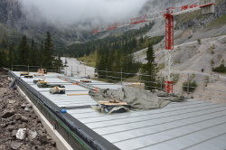 Auf der Nordseite arbeiten die Spengler mit Hochdruck daran, die bergseitigen Fassadenbereiche, in denen im Winter mit größeren Schneelasten zu rechnen ist, zu verblechen.