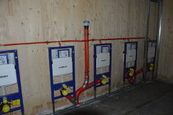 Der Installateur hat mittlerweile einen Großteil der Wasserleitungen in der Hütte verlegt, die Unterputzinstallationen in den WC's stehen auch schon fast alle, die ersten Abwasser-anschlüsse sind gesetzt. Kurzum: Die Sanitärarbeiten gehen gut voran.