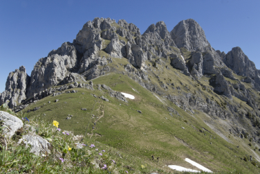 Deutlich weiter, aber landschaftlich sehr ansprechend, wäre der Abstieg vom Gipfel über den Ostgrat und links haltend bis ins Gehrenjoch. Aus dem Joch nach Westen auf markiertem Pfad ein wenig hinab und die nordseitigen Steilhänge unter der Schneid bis ins Sabachjoch queren. Zu Saisonbeginn oder -ende liegt in den grimmigen Nordhängen oft reichlich Schnee – dann kann diese Querung gefährlich sein. Vorsichtshalber sollte man dann in Richtung Musaualpe gegen Nordwesten absteigen und bei der Verzweigung links abdrehend über einen sonnseitigen Pfad schneefrei ins Sabachjoch aufsteigen. Das ist in jedem Fall die sicherere Alternative und sie bringt nur einen Zeitverlust von etwa einer halben Stunde (ca. 180 Hm Zwischenabstieg).