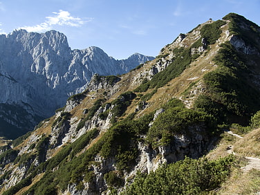 Aufstieg: Vom Parkplatz bei der Griesner Alm über den Bach und in das obere Kaiserbachtal. Auf breitem Weg in den Wald und anschließend auf freien Hängen weiter. Bei der Abzweigung in das Griesener Kar geradeaus und auf das Stripsenjoch zu. Die Abzweigung zum Eggersteig (Steinerne Rinne) ebenfalls links liegen lassen und in Kehren zum Stripsenjoch und Stripsenjochhaus hinauf.