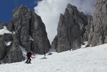 Die enorm steile und anspruchsvolle Rinne zum Schönwetterfensterl, bleibt den besten Tourengehern vorbehalten. Mit Fellen kann man meistens nur das unterste Stück des Steilhangs aufsteigen. Mühsam schleppt man die Ski oder Firngleiter hinauf und wartet, bis der Schnee in der schattseitigen Rinne auffirnt.