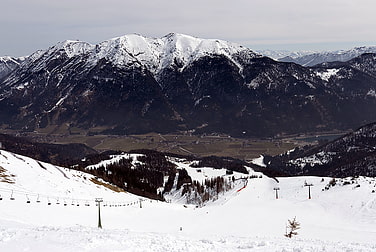Der Aufstieg schwenkt nach rechts und steigt auf dem breiten Pistenhang mäßig steil gegen Westen an, quert mittendrin ein Sträßchen und stößt zum riesigen Gasthaus mit dem Namen "Christlumalm" (1231 m). Dort etwas links halten, ein kurzes Stück eben dahin und zu den Talstationen eines Schlepplifts, einer Doppelsesselbahn und eines "Cabrio-Flitzers". Neben den Liftkabeln gegen Westen weiter und an der Gföllalm (1381 m) vorbei.