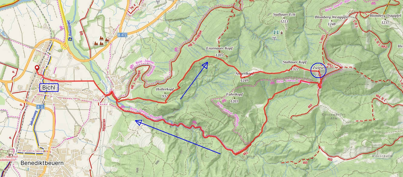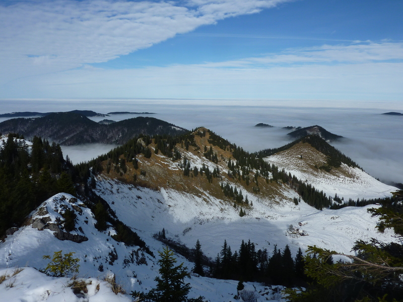 Überschreitung des Zwiesels (1348m) von Bichl aus. Wegen Schwierigkeiten mit dem Zug von Lenggries nach München wieder zurück ab Bichl.