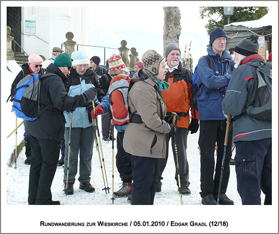 Nach einer Wanderzeit von rund 2 ½ Stunden durch verschneiten Wald blinzelte der Kirchturm der Wieskirche durch eine lichte Baumreihe. Die letzten Meter zur weltbekannten Wallfahrtskirche waren schnell geschritten. Der in den Sommermonaten sonst übliche Touristenrummel in und um die Kirche herum war zum Glück um diese Jahreszeit überschaubar.