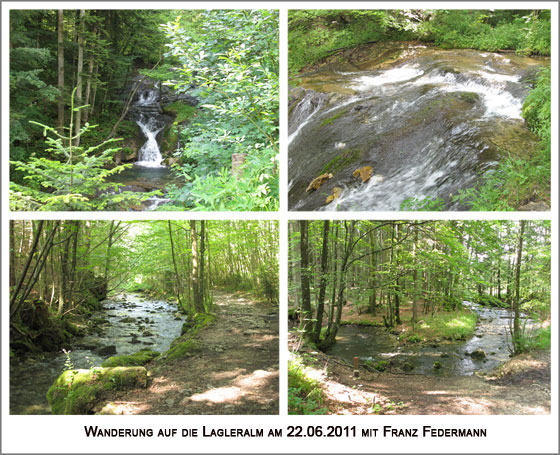Vom Gasthof führte ein gemütlicher und schattiger Weg am Fluderbach entlang stetig nach oben. Der Bach weist einen äußerst unterschiedlichen Verlauf auf. Streckenweise schlängelt er sich gemächlich durch den Wald und stellenweise stürzt das Wasser tosend an steilen Felsstufen hinab. Der Weg war kurzweilig, weil auch ein paar steilere Anstiege zu bewältigen waren. Nach mehr als 1 Stunde Gehzeit war die Lagleralm erreicht, die nun zum längeren Verweilen einlud. Zurück ging es auf dem selben Weg.