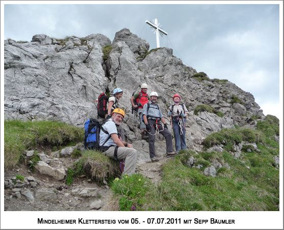 2. Tag: Der Mindelheimer Klettersteig mit seinen 4 Gipfeln war unser Ziel. Gehzeit 5 ½ Stunden mit 450 Höhenmetern. Dreimal Schafalpenkopf: Nördlicher- , 2320 m, Mittlerer-, 2301 m und Südlicher Schafalpenkopf, 2272 m und schließlich das Kemptner Köpfl, 2192 m. Zur Kaffeezeit auf der modernisierten Mindelheimer Hütte, 2013 m (2. Übernachtung).Drei Teilnehmer gingen mit zum Liechelkopf, 2384 m, zwar weglos im Wiesenhang, aber zu unserer Überraschung ganz nah an einem Rudel Steinböcke. Aufstieg 1,5 Stunden mit 370 Höhenmetern.