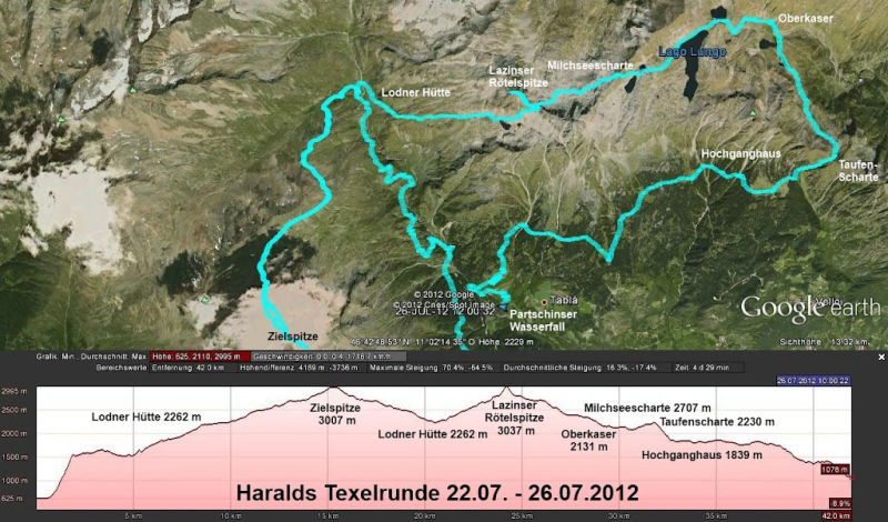 Sonntag, 22.07.: Anreise nach Rabland (Vinschgau) und Auffahrt mit der Texelbahn zum Giggelberg, 1565 m. Vorbei an Nassereith wanderten wir immer dem Zielbach entlang zur Lodnerhütte, 2250 m (CAI).