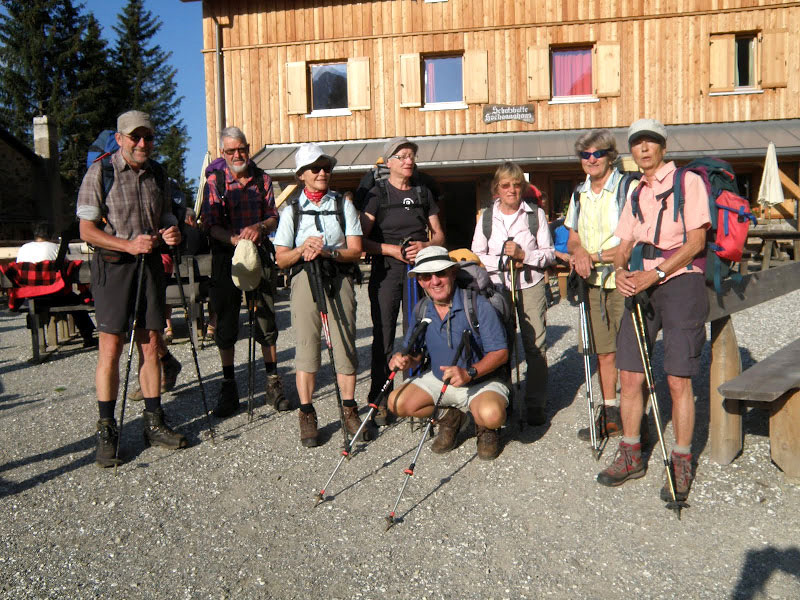 Montag, 23.07.: Ein schöner Wiesensteig führte uns über Almhänge, vorbei unterm Blasiuszeiger in ein schönes Hochtal. Über Blockgelände und Restschneefelder führte uns ein steiler Steig, der Trittsicherheit und Schwindelfreiheit verlangte, zur 3008 m hohen Zielspitze. Der Blick reichte von der Marmolata bis zum Ortler. Abstieg auf gleichem Weg zur Hütte.