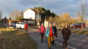 Anschließend geht es runter zur Mangfall. Ab hier ist die Tour nicht ganz unanspruchsvoll, es geht immer wieder kurze Stücke steil bergauf und bergab, Minizuflüsse sind ohne Brücke zu überwinden.Wir gehen unter der bereits erwähnten Autobahnbrücke durch. Im Winter sieht man auch die interessanten Felsstrukturen des Hochufers, wir bleiben am rechten Ufer, bis wir bei Valley zum linken Ufer wechseln. Wir kommen durch kleine Ansiedlungen um Au- und Anderlmühle, kurz vor Hohendilching geht es wieder runter zum Ufer zur Skulpturenlichtung, wo jedes Jahr neue Plastiken hinzukommen. Die Besichtigung verbinden wir mit einer Rast. Anschließend geht es wieder auf die rechte Seite, bis wir bei der Grubmühle die Mangfall ein letztes Mal überqueren und durch den Teufelsgraben unter der historischen Rohrbrücke der Münchener Wasserversorgung hindurch zum heutigen Ziel Kreuzstraße wandern. Zum Abschluss kehren wir beim Bartewirt ein – eine sehr empfehlenswerte Wirtschaft.