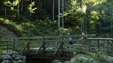 Wir kommen zum Gasthaus Adlgaß, setzen uns schon mal auf die Stühle und blicken Richtung Gipfel – ganz schön weit weg. Am Frillensee ziehen die Nebel weg und die Berggipfel spiegeln sich im Wasser. Über eine Fahrstraße kommen wir zum Bayerischen Stiegl – hier zweigt der Weg zum Pidinger Klettersteig ab – und erreichen eine Holzlege mit dem Hinweisschild, dass jeder ein Scheit mitnehmen soll. Also packen wir das Holz auf die Rucksäcke und wandern weiter.