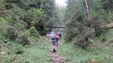 Bemooste Bäume, Flechten und Mooskissen erfreuen unser Auge und die ersten Pilze, die wegen des tagelangen Regens aus dem Boden geschossen sind, erregen unser Interesse. Leider ist der riesige Steinpilz am Wegesrand wurmstichig. Als wir an einer Weggabelung mit dem Schild „Achtung Staatsgrenze“ vorbeikommen, biegen wir nach rechts ab und der steile Weg führt uns in der Mitte eines bewaldeten Bergeinschnittes bis zum Sattel des Grünsteins. Hier warten zwei Bankerl und ein hölzernes Gipfelkreuz des Mittenwalder Ziegenzuchtvereins auf uns Wanderer.