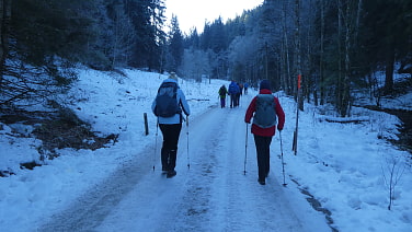 Vom Parkplatz Hennerer aus in Schliersee geht es die Forststraße im Breitenbachtal hinauf. Die Landschaft ist tief verschneit, die Sonne strahlt vom azurblauen Himmel und lässt den Schnee glitzern. Mal wieder Rudiwetter! Der gemächlich ansteigende Weg ist gut begehbar und somit kommen wir schnell voran und gut gelaunt im Bodenschneidhaus an. Wie immer begrüßt uns der Hüttenhund, den wohl jeder kennt. Was für eine Gemütlichkeit in der Hütte. Das Feuer bollert im Ofen leicht dahin. Es ist sehr warm und da unser Tisch gleich neben dem Ofen platziert ist, dauert es nicht lange und alle haben knallrote Wangen und sehen blendend aus. Wir stärken uns. Ich bin schon einige Male in der Alpenvereinshütte gewesen und war immer zufrieden. Das Personal ist freundlich und die Speisen schmackhaft und der kuschelige Hund anhänglich.Als wir den Rückweg antreten, sind wir gestärkt und gehen zügig zum Ausgangspunkt zurück. Eine gelungene Tour im Winterwunderland!