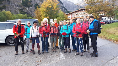 Wir starten an der Gramaialm auf ca 1200 m – zu erreichen über die 7 km lange Mautstr von Pertisau aus - und werden schon von Sonnenstrahlen begrüßt. Heute wird es ein super Herbsttag. Die Gipfel leuchten zwischen den bunten Blättern der Bäume. Wir steigen auf und freuen uns auf die Hütte, die auf 1930 m liegt und heute am vorletzten Tag der Saison noch geöffnet hat. Bänke werden extra für uns im Freien hergerichtet. Ein kalter Wind weht, aber in der Sonne kann man es schon aushalten. Der Anstieg zur Lamsenspitze ist schon mit Schnee überzuckert. Wir bleiben länger sitzen, bevor es wieder runter ins Tal geht. Einige von uns kehren unten an der Gramaialm noch ein. Und wer es nicht weiß: wir waren wieder einmal auf dem Adlerweg,