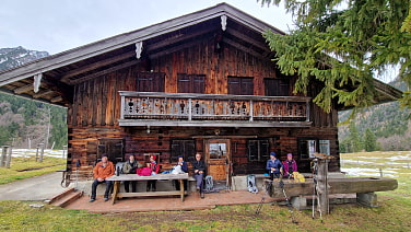 Vom Bahnhof Osterhofen geht es über die Leitzach und dann am wegen der Schneeschmelze stark rauschenden Alpbach entlang nach Mieseben, ein sehr angenehmer Weg. Bis zur Klarer Alm, die wir für eine kurze Pause nutzen, geht es über einen Forstweg, anschließend auf einem schön angelegten Wanderweg über die Seebergalm (2. Trinkpause) zu unserem Tagesziel, dem Seebergkopf. Selbst oben ist es fast schneefrei, gelegentlich lugt die Sonne zwischen den Wolken hervor, wir genießen Gipfelrast und Aussicht. Beim Abstieg über die Neuhüttenalm lockt noch ein nettes Aussichtsplätzchen mit Bank. Nach Bayrischzell runter sehen wir noch die Spuren eines stärkeren Schneebruchereignisses, das eine weggebrochene Wegstück ist gut überbrückt.Den Abschluss der angenehmen Wanderung bietet die Einkehr im Café Huber mit den bekannt guten Torten.
