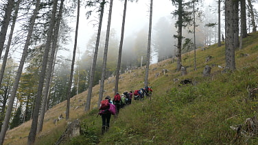 Die Wettervorhersage ist sehr gut, zügiges Umsteigen in Lenggries sichert Sitzplätze im Bus. Beim Start an der Kaiserhütte ist von Sonne noch nichts zu sehen. Beim Aufstieg kommen wir erst mal in den Hochnebel, auch das ist eine reizvolle Stimmung. Cica 300 m unter dem Gipfel kommen wir aus dem Nebel raus, noch schauen nur einzelne Gipfel hervor. In der Sonne erreichen wir den Gipfel, auf dem sehr bequem ein Fußballfeld Platz hätte.