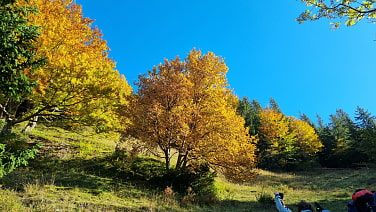 Wir fahren mit der Bahn nach Schliersee und weiter mit SEV nach Fischhausen-Neuhaus.Ein strahlendschöner Herbsttag begrüßt uns und so wandern wir auf sonnigem Weg langsam bergan.Die Bäume ringsum leuchten in den schönsten Farben und wir genießen den Weitblick zur Brecherspitz und Bodenschneid und hinunter nach Neuhaus. Auf wechselnden Wegen und Pfaden, mit moosbewachsenen Steinen und herumliegenden Stämmen und Ästen, umrunden wir den Berg und gelangen so zu unserem ersten Ziel.Mitten im sonnendurchfluteten Wald, umgeben von Felsen und hohen Gräsern, steht das winzige Gipfelkreuz vom Hirschgeröhrkopf. Sylvia trägt uns ins Gipfelbuch ein. Hier lassen wir uns nieder und genießen, auch ohne Aussicht, diesen besonderen Ort und unsere Brotzeit.Weiter geht’s nun abwärts zur Burgruine Hohenwaldeck.Ende des 13.Jahrhunderts wurde die Burg von den Herren von Waldeck erbaut und in der Historie u.a. als Fluchtburg beschrieben. 1480 durch einen Felssturz zerstört, wurde sie nie wieder aufgebaut. Nach dem Ende des Geschlechts der von Waldeck ging die Herrschaft in diesem Gebiet an die Herren von Maxlrain über.Wir besichtigen die Überreste der Burg, die nach längerer Sperrung und Sanierung im Oktober 24 wieder für den Besucherverkehr zugänglich ist.Ein herrlicher Blick hinunter auf den wunderschönen Schliersee und die umliegenden Berge kröhnt diesen gelungenen Ausflug.Am Ende lockt der Schnapperwirt noch zu einer feinen Einkehr.Danke an Sylvia für diesen glücklichen Tag.