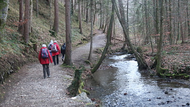 Mit der öffentlichen Anreise nach Tölz haben wir Pech. In Holzkirchen und Schaftlach müssen wir auf den Schienenersatzverker und unsere Weiterfahrt warten, insgesamt 2 Stunden. Aber immerhin stehen wir im Sonnenschein. Am Bahnhof Tölz beginnt unsere Wanderung deshalb erst um 13:00 Uhr. Schnell durchschreiten wir den noch im Schatten liegenden Christkindlmarkt, vom Kalvarienberg aus blicken wir allerdings schon in die sonnige Berglandschaft. Jetzt geht es noch einmal hinunter zur Isar, durch das Kurviertel mit Park hinüber nach Steinsäge. Dann folgen wir einem Pfad den Einbach entlang bis zur Dachshöhle. Von dort führt unser Weg wieder in Richtung Tölz. Da wir nicht trödeln und die Brotzeitpausen kurz halten, erreichen wir noch kurz vor Sonnenuntergang das Spielhahnjäger-Denkmal. Der Blick von der Isarbrücke hinauf zu den angestrahlten Kirchen des Kalvarienbergs ist zauberhaft. Nun gönnen wir uns eine längere Pause auf dem Christkindlmarkt bei Glühwein, Würstl und Schupfnudeln, bevor wir zum Bahnhof hinauf marschieren. Die Heimfahrt ist unproblematisch.