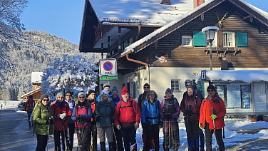Auf der Rodelstecke geht es bergab zum Spitzingsattel. Da der Bus erst in einer Dreiviertelstunde fährt, beschließen wir, zum See hinunterzugehen und weiter in den Ort. Eine gute Entscheidung, denn schon am Startpunkt (Parkplatz Kirche) wird der Bus sehr voll, und am Sattel muss eine größere Gruppe auf den nächsten Bus warten.