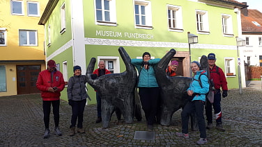 Wir starten direkt am Marktplatz von Thalmässing und nehmen den Thalachtal Panorma-Wanderweg Nr. 5, welcher sehr gut ausgeschildert und 18 km lang ist. Uns erwartet heute ein super herbstlicher Sonnentag, anfangs noch kalt, aber mit zunehmender Stunde wird es immer wärmer.Es geht durch den Wald nach Gebersdorf, dann in Landersdorf vorbei an Infotafeln über die Steinzeitgeschichte der Kelten. Wir machen Pause an einer sonnigen Felsterrasse und übersehen dabei den Abzweig zu den rekonstruierten Kelten- und Bajuwarenhäusern. Schade, aber wir wandern nicht zurück, denn der vor uns liegende Weg ist noch lang. Es gibt hier viele leuchtende Schlehensträucher, deshalb müssen wir unbedingt welche pflücken; ebenso packen wir die Rucksäcke voll mit Äpfeln, die am Wegesrand liegen. Darüber hinaus erfreuen uns überdimensional große Schammerl wie Parasol und Steinpilz. Nach dem Überqueren der Staatsstraße geht es leicht bergauf zur Auwaldkapelle – eine moderne Konstruktion – dann über Wacholderheiden zurück nach Thalmässing. Der Weg führt uns fast ausschließlich über raschelndes Herbstlaub –weich und gelenkschonend! Den Tag beenden wir mit einer Einkehr im Gasthaus Goldene Krone – dort gibt es gutes Essen zu zivilen Preisen!Tourenbegleitung, Text, Foto: Irene Neumeier←Übersicht Tourenberichte