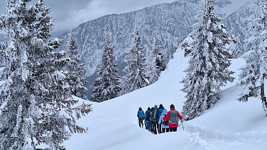 Bei Ankunft in Unterammergau auf dem Parkplatz Schleifmühlenklamm kommen wir aus dem Staunen nicht heraus. So viel Schnee! Es ist frostig und grau, wenig einladend nach den frühlingshaften Wochen im März. Heute laufen wir nicht durch die Klamm, sondern bleiben auf der Forststraße und biegen bald nach rechts ab. Langsam verzaubert uns die winterliche Stimmung. Ab und zu lugt eine blasse Sonne durch die Wolken und lässt Schnee und Raureif auf den Bäumen glitzern. Wir passieren die malerische Josephskapelle und stapfen weiter durch die weiße Pracht bis zum August-Schuster-Haus 1554m am Pürschling. Die Gipfel sind wolkenverhangen, nur die Bergnachbarn gegenüber sind zu sehen. Eine warme Suppe bei der freundlichen Wirtin tut jetzt gut!Abstieg zuerst wie Aufstieg, dann weiter unten, nahe einer Alm halten wir uns rechts und wandern steil neben dem Bach hinab ins Tal.Vielen Dank an Rudi für die schöne, vorösterliche Wintertour im Ammergebirge.