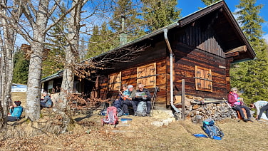 Verschoben um eine Woche starten wir bei strahlendem Sonnenschein in Klais. Den Weg nach Kranzbach verlassen wir schnell, um zum Hirzeneck aufzusteigen. Bei einer netten Hütte legen wir die erste Pause ein. Weiter geht es auf dem Winterweg über die Almweiden Richtung Elmauer Alm. Da doch deutlich mehr Schnee übrig geblieben war als wir aufgrund von Webcams erwartet hatten, wechseln wir weglos zum Sommerweg. Dort ist der Weg teils schneefrei, teils gut gespurt. So erreichen wir den Wamberg und kurz danach einen schönen Rastplatz mit freiem Blickfeld nach Norden und Süden. Auf dem Weiterweg zum Berggasthof Eckbauer legen wir noch eine Gipfelrast am Eckbauer ein.Beim Abstieg nach der angenehmen Einkehr kommen auch die Grödeln noch zum Einsatz, im oberen Bereich ist der Abstiegsweg zum Skistadion auf voller Breite vereist. Wir liegen gut in der Zeit, so wählen wir den geologischen Lehrpfad an der Partnach für unseren Weg zum Bahnhof.Ein ereignisreicher Tag bei bestem Wetter geht zu Ende.