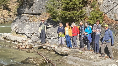 Wir starten bei bestem Wetter in Altenau, anfangs in freier Kulturlandschaft. Im Wald geht es steil in die Schwepbachschlucht runter, anschließend wieder hoch. Beim Kraftwerk Kammerl nehmen wir noch den Abstecher zur Scheibum. Vor der Engstelle des Ammerdurchbruchs kommt man - teils mit stählernen Tritthilfen - um einige Ecken herum. Wir schaffen heute die ersten drei, für die letzte ist der Wasserstand zu hoch. Über den Aussichtspunkt geht es zurück und über die Ammer. Dort finden wir ein Plätzchen für die erste Pause. Die Schleierfälle sind nicht mehr ausgeschildert, der Abzweig vom Wanderweg ist aber nicht zu übersehen. Der Weg führt am Quellbereich der Schleierfälle vorbei, es sprudelt so kräftig, dass etwas Wasser über den Weg läuft. Kurz vor dem Abbruch schwenkt der Weg nach links, um dann in Ufernähe zu den Fällen zurückzuführen. Die Beschilderung ist erneuert worden, es ist jetzt eindeutiger was erlaubt und was verboten ist.