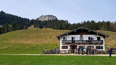 Gut gelaunt starten wir unsere Tour am kostenlosen Parkplatz am Friedhof in Nußdorf. Es ist kein Schnee mehr in Sicht, die Sonne lacht vom nicht ganz ungetrübten Himmel und es ist noch recht frisch. Wir sind froh um unsere Jacken. Schlüsselblumen und Huflattich leuchten um die Wette und schnell gewinnen wir an Höhe auf unserem Weg Richtung Daffnerwald-Almen. Nach einem kurzweiligen Aufstieg erreichen wir schließlich die Lagleralm, im Hintergrund begrüßt uns schon der Heuberg. Die Hütte ist heute gut besucht und die Wirtsleute haben alle Hände voll zu tun. Wir ergattern einen Platz vor der Hauswand. Dort lässt es sich gut aushalten, es ist nicht zu warm und nicht zu kalt, gerade recht! Wir genießen unseren Platz an der Sonne und nach einer ausgiebigen Hüttenrast und dem obligatorischen Gruppenfoto machen wir uns wieder auf den Rückweg. Abstieg wie Aufstieg, aber nicht ohne vorher der Wallfahrtskirche Maria Heimsuchung in Kirchwald einen Besuch abzustatten. Der Messner ist heute ziemlich grantig und darum bekommen wir leider keine Kirchenführung. Macht nichts, wir lassen auch ohne ihn die Magie von diesem besonderen Ort auf uns wirken. Für das letzte Stück des Abstiegs wählen wir nach der Kirche einen gut begehbaren Steig, der uns zügig wieder zurück zum Parkplatz bringt.Rudi, danke für den gelungenen Tag und die schöne Tour - Rudiwetter inklusive!