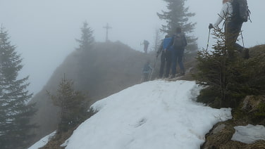 Wir starten bei kühlem aber angenehmen Wetter an der Kirche Spitzingsee. Entlang dem Forstweg geht es über die Untere Maxlrainer Alm zur Schwarzenkopfhütte. Weiter steigen wir über einen schönen Steig zum Rauhkopf. Es geht über Almwiesen bei mystischen Lichtverhältnissen mit Nebel und Sonne steil bergan. Am Gipfel machen wir eine Rucksackpause bei Windstille und jetzt dichten Nebel. Leider gibt es keine Aussicht.Nach einem Abstieg durch Wald und Wiese erreichen wir die Bergstation der Taubensteinbahn und anschließend die Obere Maxlrainer Alm.Die ist geöffnet und wir stärken uns am warmen Kachelofen. Inzwischen hat sich der Nebel gelichtet und beim Abstieg zum Spitzingsee genießen wir die Sonne und den Ausblick zum Schinder.