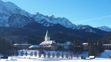 Wir steigen in Klais am Bahnhof aus und gehen entlang der Straße, bis der Abzweig nach Elmau kommt. Da alles vereist ist, legen wir die Grödeln an. Durch den Wald leicht bergauf erreichen wir die Lichtung mit Schnee und herrlichem Ausblick vor dem Hotel Kranzbach. Weiter führt uns der Weg zum Schloss Elmau, dann entlang des Ferchenbaches zum Ferchensee. Hier ist es ausgesprochen kalt und wir freuen uns schon auf die Wirtschaft am Lautersee, die geöffnet hat. Heute ist ein super Wintertag und wir genießen den Weg, der jedoch ca. 15 km beträgt. Über das Laintal steigen wir ab; der Weg ist gefroren, aber es ist eine Spur von Holzspänen gelegt, die ein Ab-/Ausrutschen verhindern soll. Diverse Stufen führen hinunter nach Mittenwald und wir sehen unterwegs bizarr gefrorene Eiszapfen im Bachbett. In Mittenwald, der Geigenbauerstadt mit den vielen Lüftlmalereien, wartet schon der Zug auf uns, der uns wieder nach München bringt.