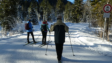 Der erste Abschnitt der Loipe bis zum Parkplatz Klamm fordert uns mit einigen Steigungs- und Abfahrtsstrecken heraus. Dort wechseln wir auf die andere Seite der Weißach und es geht gemütlicher weiter Richtung Glashütte. Hinter Bayerwald machen wir auf einer Bank in der Sonne Brotzeitpause.