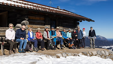 Wir fahren mit der Bahn nach Mittenwald, wo unsere Bergwanderung beginnt. Zunächst geht es durch den Ort, dann eine steile Treppe hinauf zur Talstation der Kranzbergbahn. Jetzt sind wir richtig warm geworden. Unser Weg führt uns zur Gaststätte St. Anton. Wegen des vielen Schnees ist der dortige Barfußpfad keine Option für uns. Teilweise steil ansteigend erreichen wir schließlich den Gipfel des Hohen Kranzbergs, auf dem eine Schutzhütte steht. Bei strahlendem Sonnenschein genießen wir die Gipfelrast und die wunderbare Rundumsicht auf den Bänken an der warmen Holzwand der Hütte.Für unseren Weiterweg zum Ferchensee müssen wir eine Wiese queren, wo unter dem tiefen Schnee sich große Wasseransammlungen gebildet haben, was bei manchen zu nassen Füßen führt. Dennoch steigen wir bei empfundenen sommerlichen Temperaturen frohgemut durch den Wald hinab zum Ferchensee, wo wir in der Gaststätte ausgiebig Speis und Trank genießen. Anschließend führt uns der Weg um den See herum. Es gibt viele Fotomotive mit dem leichten Nebel und den dahinterliegenden Bergen. Im Schatten sind die Wege sehr eisig und wir legen die Grödel an. Vorbei geht es am Lautersee mit dem Postkartenmotiv der Kapelle Maria Königin vor dem verschneiten Karwendel und schließlich durch das wildromantische Lainbachtal mit seinen Wasserfällen nach Mittenwald, wo unsere schöne Tour ihren Abschluss findet.