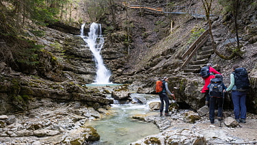 Der Weg führt uns entlang des Wasserparadieses im Jenbachtal. Ein besonderes Highlight sind dann die Jenbach-Wasserfälle. Über mehrere Kaskaden stürzt das klare Bergwasser hier in die Tiefe und schafft perfekte Fotomotive. Der Weg ist gesäumt von unzähligen Leberblümchen und Buschwindröschen. Auch Schlüsselblumen dürfen nicht fehlen. Schließlich erreichen wir den Gipfel der Farrenpoint (weiblich!) mit sehr schönem Rundumblick, u.a. auch auf Wendelstein und Breitenstein.