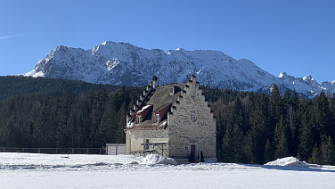 Am Unteren Kranzberg zwischen Schloss Kranzbach und Schloss Elmau liegt der idyllische Alpenfriedhof "Stiller Wald Mittenwald“ auf 1100 m Meereshöhe.Dorthin führt uns die Wanderung vom Bahnhof Klais. Wir bekommen eine Führung durch einen Mitarbeiter der Bayrischen Staatsforsten und erfahren wichtige und interessante Details über den ersten Alpenfriedhof Deutschlands. Hier fügt sich die letzte Ruhestätte behutsam in die Natur ein: die Asche der Verstorbenen wird in biologisch abbaubaren Urnen aus heimischen Holz an ausgewählten Bäumen beigesetzt. Gedenktafeln erinnern dezent an die Verstorbenen. Die Grabpflege übernimmt die Natur selbst.Umgeben von Jahrhunderte alten Bäumen und der eindrucksvollen Bergkulisse entsteht eine Atmosphäre der Geborgenheit und wer sich eine schlichte naturnahe Ruhestätte wünscht findet sie hier mitten im Wald. Ein einzigartiger überdachter Andachtsplatz mit seinem organisch geschwungenem Holzdach in Form eines Blattes steht für die Trauernden oder einfach nur zur stillen Besinnung zur Verfügung.Nachdem wir uns von unserer freundlichen und kundigen Führung verabschiedet haben führt uns der Weg weiter über Schloss Elmau, am Ferchenbach entlang zum Ferchen- und Lautersee. Auf der Lautersee-Alm gibt es noch sonnige Plätze auf der Terrasse wo wir einkehren bevor wir durch das Lainbachtal zum Bahnhof in Mittenwald gelangen.Eine ganz besondere Winterwanderung