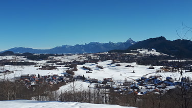 Am Bahnhof in Pfronten-Steinach, durch Pfronten-Dorf, dann Pfronten-Ried suchen wir den Weg – ergebnislos, aber wir sehen schöne Häuser und die Sonne strahlt! Endlich finden wir die Tourist-Info, wo der eigentliche Weg beginnt (3 km zusätzlich zurückgelegt). Jetzt geht’s genau nach der Beschreibung, denn es gibt keine eigene Markierung. Der Weg ist zum Teil identisch mit der Allgäuer Triologie. Über Röfleuten erreichen wir Kappel und nun geht es bergauf, hinauf zur Kappeler Alp auf 1350 m. Diese 500 Hm sind ganz schön anstrengend bei Sonnenschein und schneebedecktem Weg. Wir gönnen uns eine kleine Pause in der Alp, bevor wir absteigen über Maria Trost. Der Pfad ist verschneit und vereist. Wir legen die Grödeln an – eine kleine Herausforderung erwartet uns. In Nesselwang angekommen nehmen wir den Bus 55, der uns nach Marktoberdorf bringt – Fahrzeit eine Stunde weniger.