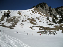Nach den Schönfeldalmen gelangen wir über ein weites Schneefeld hinauf zum Joch unterhalb des langgezogenen, schmalen Jägerkampgipfels. Dieser weist selbst dann, wenn er schneefrei ist, sehr wenige Sitzplätze auf. 14 Teilnehmer sind auch für erfahrene Bergführer eine Herausforderung. Da wir nicht stehend Brotzeit machen sollen und wollen, werden wir über das Tanzeck und die Schnittlauchmoosalm zum Rauhkopf (1689 m) umgeleitet, wo wir wie eine Schar hungriger Bergdohlen dicht gedrängt auf dem sonnenwarmen, trockenen Gipfel unterkommen. Dem Rudi wird der Blutdruck gemessen. Nach einem artistischen Abstieg über querliegende Bäume und Schneelöcher kehren wir beim Wirt Walter auf der Oberen Maxlrainer-Alm (Schneetechnik und mehr) ein und werden unserer verdienten Entspannung zugeführt.