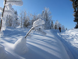 Erst wenn Väterchen Frost die Kälte richtig klirren lässt, zaubert der Winter Märchenlandschaften und uns die roten Nasen ins Gesicht. Am Skistadion in Garmisch-Partenkirchen wurden wir mit 12° Minus empfangen, so dass wir zunächst einmal damit zu tun hatten, 14 Hände auf Überlebenstemperatur zu bringen, bevor wir beim Aufstieg nach Wamberg beim Anblick der traumhaften Landschaft, dieses Problem einfach vergaßen. Wetterstein und Karwendel, Wank und Kramer – eine Rundumschau in fleckenlos glitzerndem Weiß mit stahlblauem Himmel. Bäume und Sträucher haben sich durch Frost, Schnee und Rauhreif in bizarre Skulpturen verwandelt und wir uns in staunende Betrachter. An der temperierten Hauswand beim Eckbauer konnten wir unsere Pause im Freien genießen, um uns dann vor dem Rest des Abstiegs durch die eisige Partnachklamm beim Hanneslabauer mit Kaffee und Kuchen zu wärmen. Die Eisformationen in der Klamm haben dieser wunderschönen Kältewanderung den angemessenen Abschluss geboten.