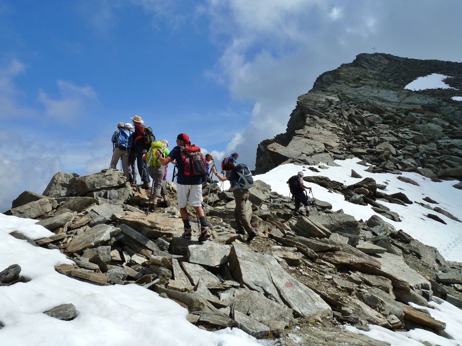 Hochreichkopf 3008 mIn Richtung Finstertaler Alm wird ein wunderbarer Zirbelkiefernwald durchquert. Ab hier baumlos auf steilem Wiesengelände und über einen langen Moränenrücken zur Stirnmoräne des kleinen Steinkarferners. Bereits unterhalb des zugefrorenen Karsees beginnt das geschlossene Altschneefeld, das über mehrere, immer weiter ansteigende Absätze bis an den Einstieg zur Hochreichscharte reicht. Die Bewältigung des im unteren Bereich schneebedeckten, durchnässten, rutschigen Schuttkegels auf die Scharte ist der schwierigere Teil der Gipfelbesteigung, danach folgt auf 100 Höhenmetern gut begehbares Blockgestein. Blick ins Ötztal und auf die Sellrainer Riesen, sofern es die Wolkenschwaden erlauben.