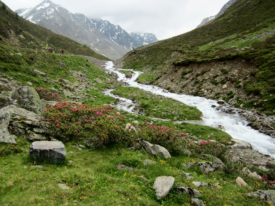 Vom 1538 m hoch gelegenen Niederthai ist der Hüttenanstieg mit erschwertem Gepäck recht komfortabel. Die gute Bergwetterprognose wird sich bewahrheiten und so ist die Vorfreude auf dem Weg durch das romantische Horlachtal, begleitet vom Horlachbach, angesichts der herausspitzenden Dreitausender berechtigt optimistisch.